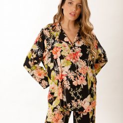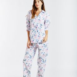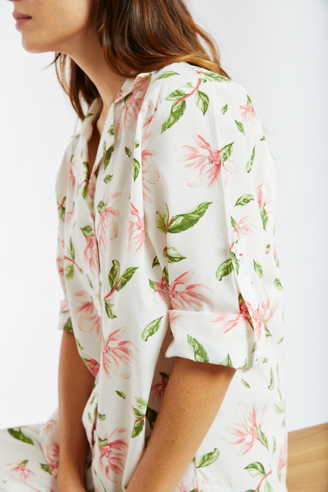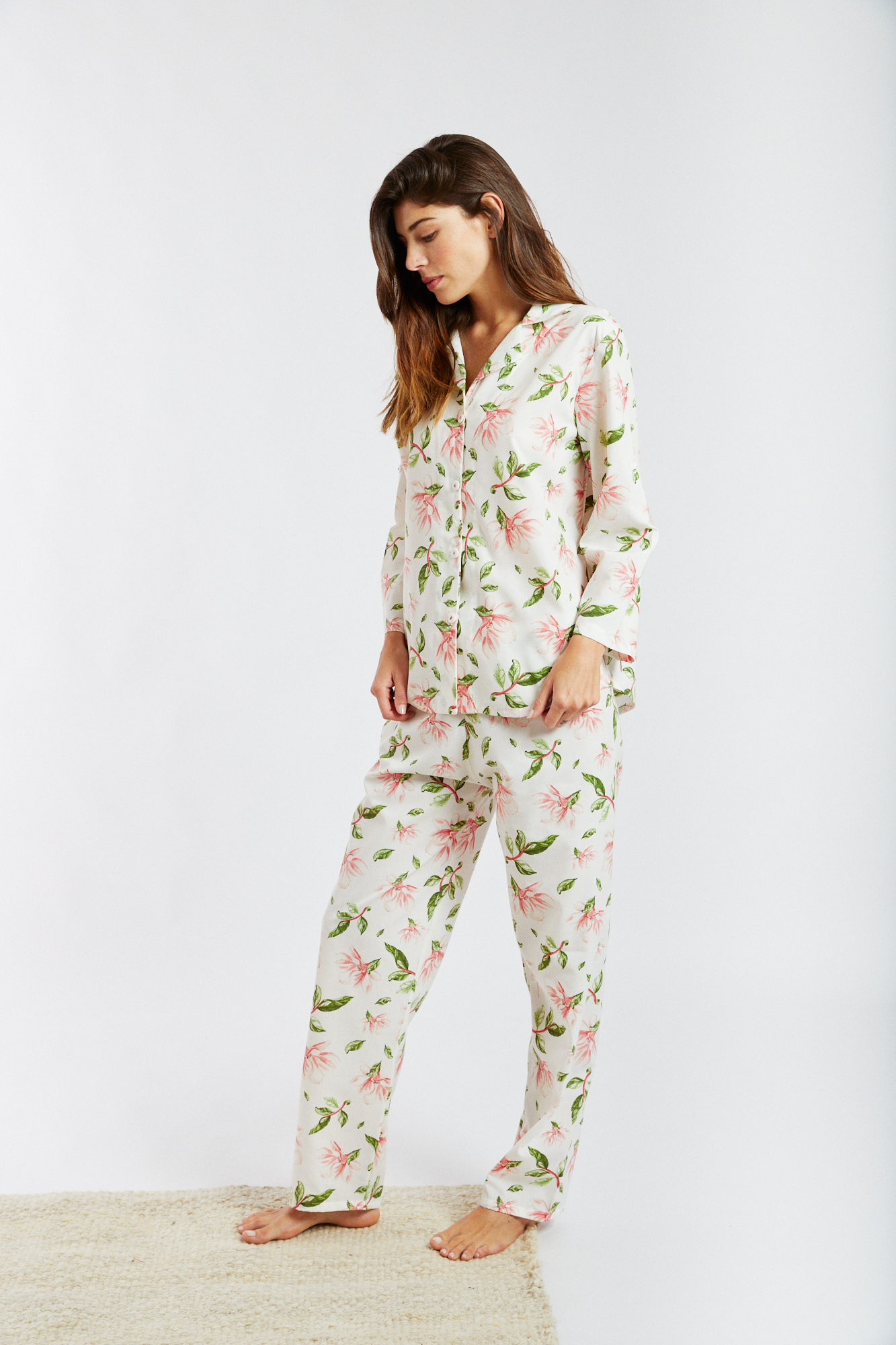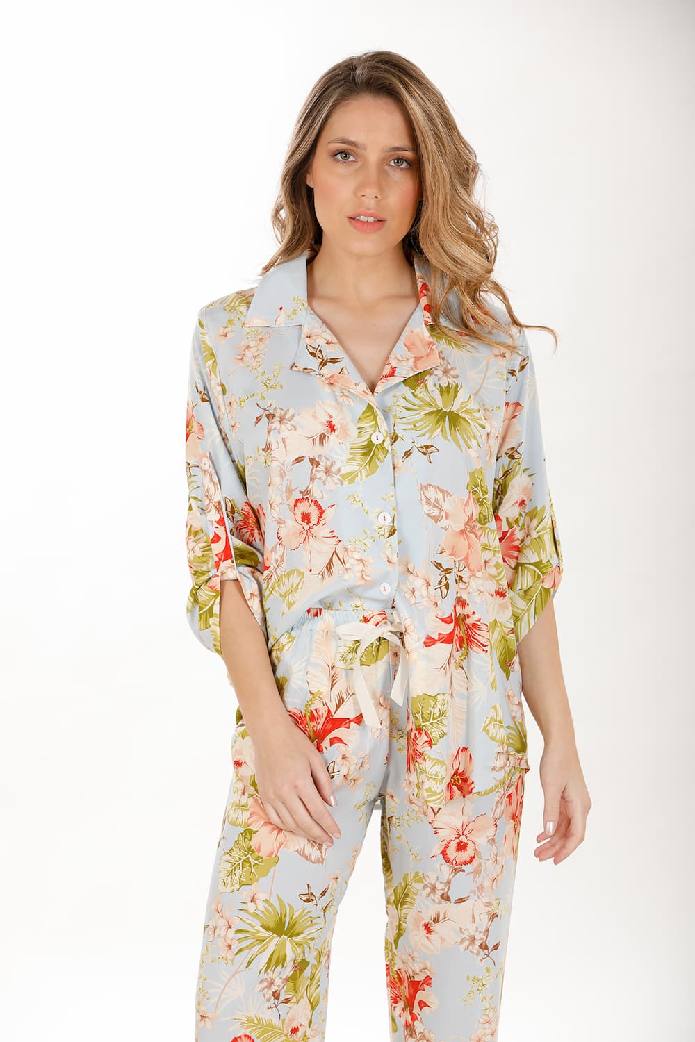 Pijama de camisa manga larga con botones y trabas en las mangas. Pantalón con elástico en cintura y cinta decorativa al tono. Este conjunto lo podés usar para dormir o casual. Es muy lindo y cómodo.